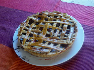 Com a restante massa, estenda e faça tiras e entrelaçe por cima da tarte. (eu confesso que sou um bocado trapalhona e que a minha não ficou perfeita). Pincelei com ovo batido.