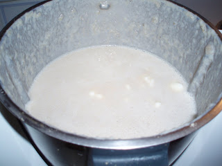Juntar a farinha, a margarina, os caldos (eu não tinha e usei 1/3 de sopa de marisco), a noz moscada e a pimenta. Programar 8mn/Temp. 90º/ Vel. 4