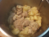 Junte a carne com o tempero, a folha de louro, coloque a Varoma e programe 15 Min/ Varoma/Colher Inversa / Vel. Colher (eu pus mais 10 mn pois a carne de porco gosto de a cozinhar bem)