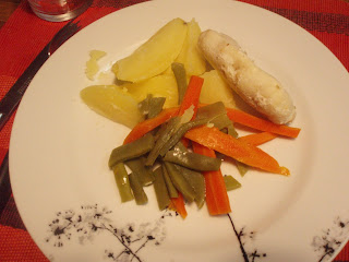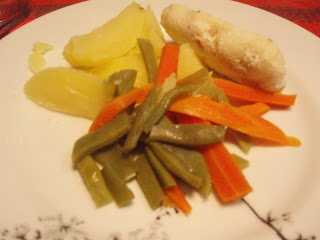 Desta vez foram uns medalhões de pescada acompanhados por batata cozida, cenoura e feijão verde.