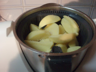 Desta vez depois de fritar as batatas juntei-as no copo e pus mais 5 mn pelo que estas ficaram tipo "rugidas" (não sei se esta palavra existe) como nos rojões.