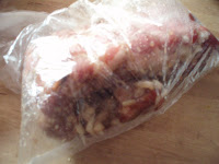 De vêspera temperei os cubos de carne com 2 dentes de alho e massa de pimentão.
