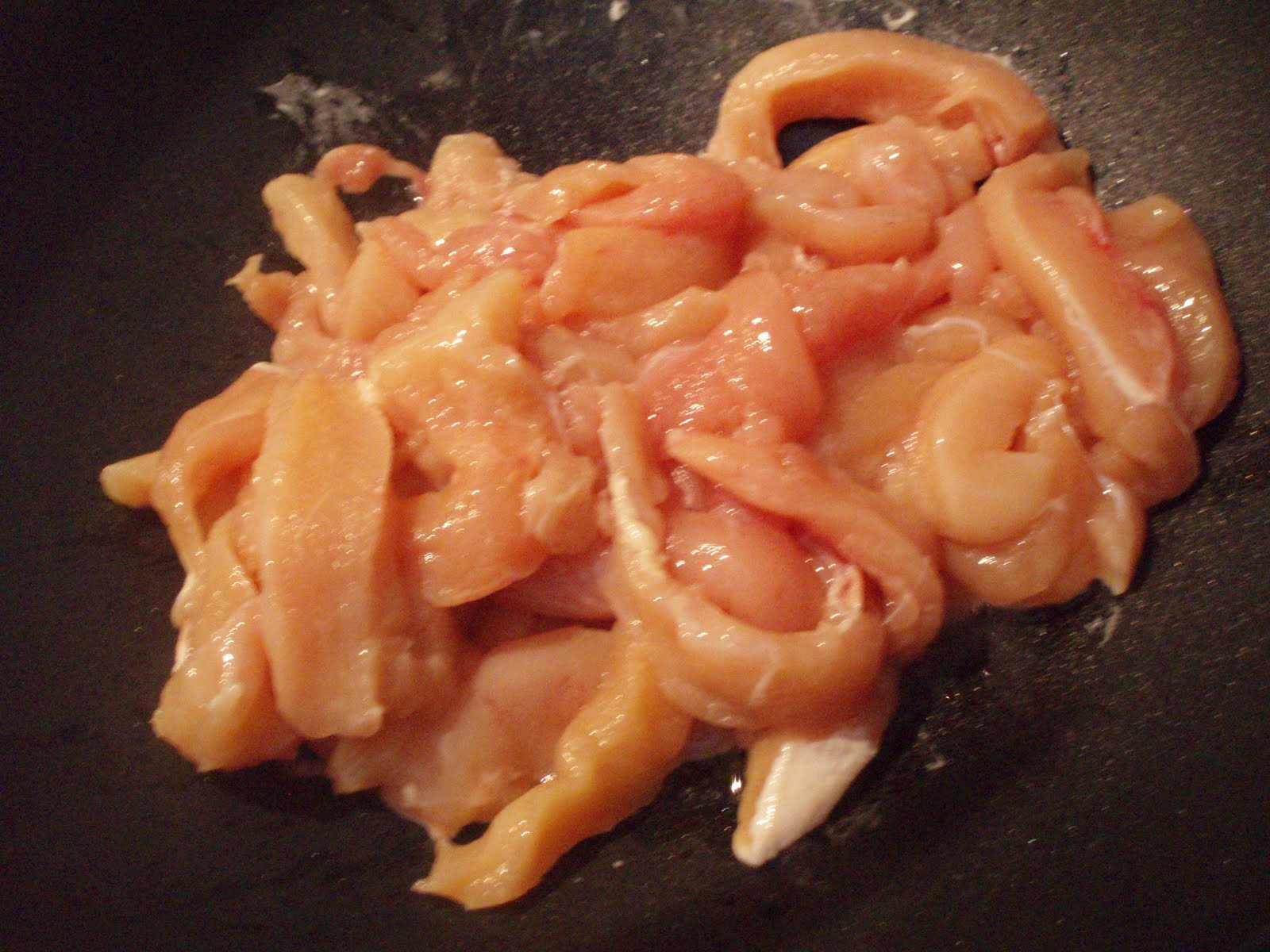 Colocar num wok 1 colher de sopa de óleo e quando tiver quente colocar as tiras de frango.